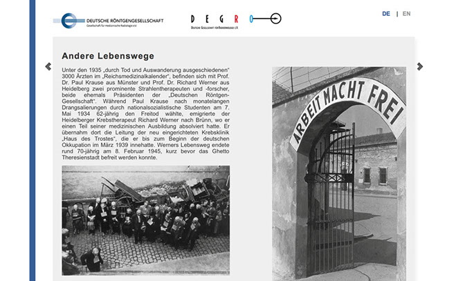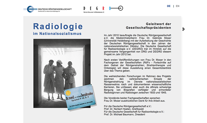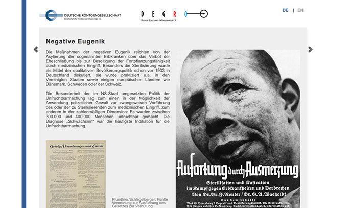 Die Ausstellung zeigt den weitreichenden verbrecherischen Einsatz der Röntgenstrahlung im Dienste nationalsozialistischen Rassenwahns und dokumentiert wissenschaftliche Karrieren. Sie umfassen aber auch die oftmals schwierige Bergung von Biografien verfolgter und ermordeter Radiologinnen und Radiologen zwischen 1933 und 1945.
