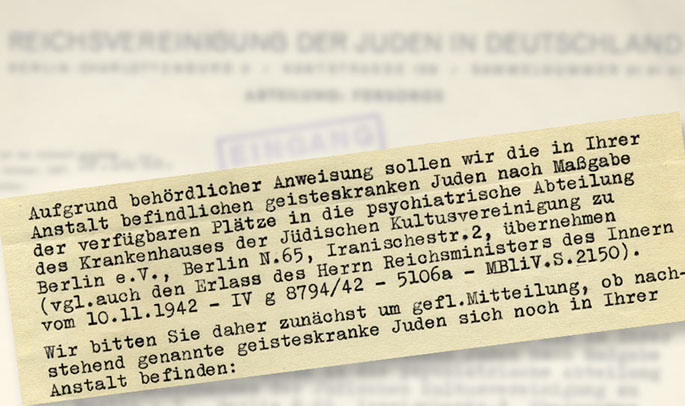 "Doppelt stigmatisiert. Schicksale jüdischer Psychiatriepatienten in Berliner Heil- und Pflegeanstalten unter dem NS-Regime". Die Ausstellung informiert über die Lebensbedingungen jüdischer Psychiatriepatienten in der Reichshauptstadt zwischen 1933 und 1945.